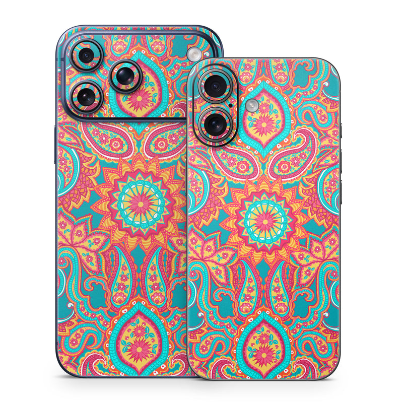 iStyles iPhone 17 Series Skin design of Pattern, Paisley, Motif, Visual arts, Design, Art, Textile, Psychedelic art, with orange, yellow, blue, red colors, and tagged with patterns, flowers.