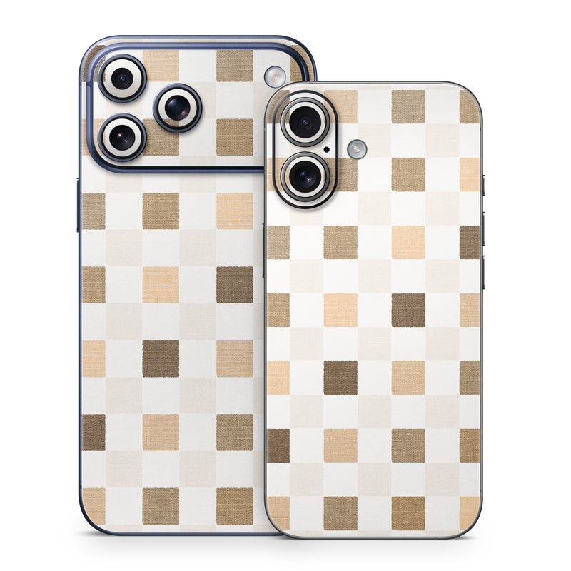 iStyles iPhone 17 Series Skin design of Brown, Rectangle, Beige, Textile, Sleeve, Grey, Khaki, Material property, Symmetry, Art, with white, gray, brown colors, and tagged with patterns, checkered, squares, brown, carpet.