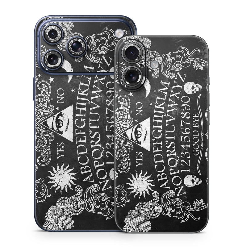 iStyles iPhone 17 Series Skin design of Text, Font, Pattern, Design, Illustration, Headpiece, Tiara, Black-and-white, Calligraphy, Hair accessory, with black, white, gray colors, and tagged with signs, skulls, black, demons, ghosts, magic, magick, paranormal, skull, spirit, talking.
