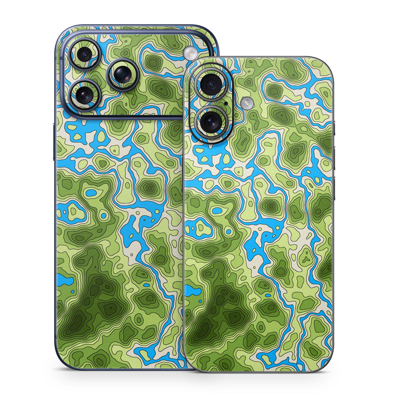 iStyles iPhone 17 Series Skin design of Botany, Azure, Organism, Vegetation, Aqua, Terrestrial plant, Symmetry, Electric blue, Pattern, Art, with green, blue colors, and tagged with patterns, geography, map, outdoors, topo, topographic, topography, travel.