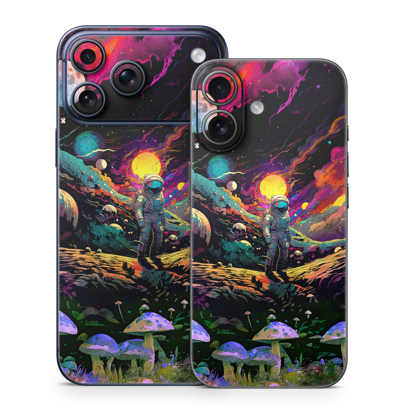 iStyles iPhone 17 Series Skin design of Light, Nature, Purple, Umbrella, Plant, Art, Terrestrial plant, Natural landscape, Astronomical object, Space, with black, white, purple, red, gray, orange, yellow, blue, green, brown colors, and tagged with space, people, fantasy, astronaut, plants, sun, moon, galaxy, mushrooms.