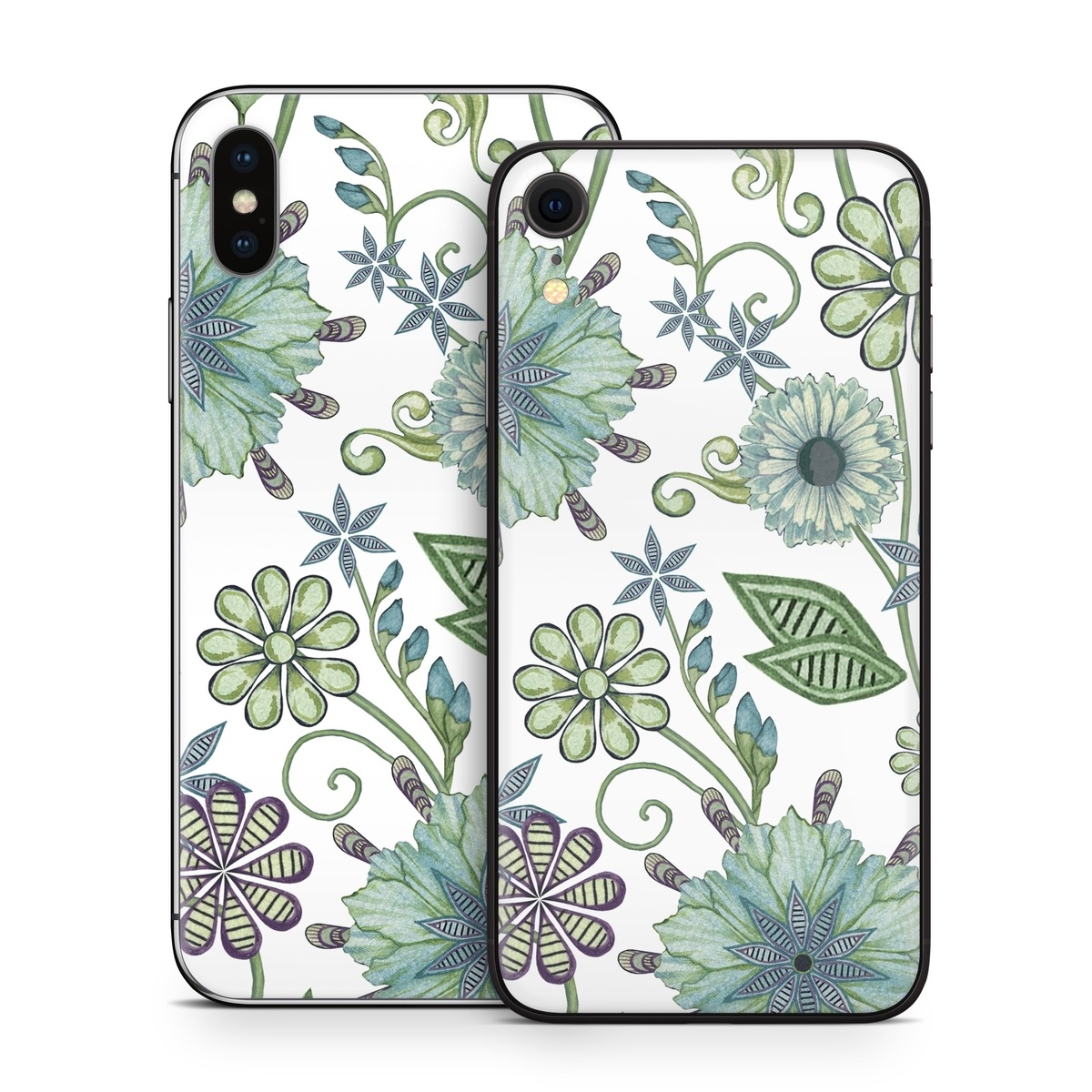 iStyles iPhone X Series Skin design of Green, Pattern, Flower, Botany, Plant, Leaf, Design, Wildflower, with white, green, blue colors, and tagged with patterns, flowers.