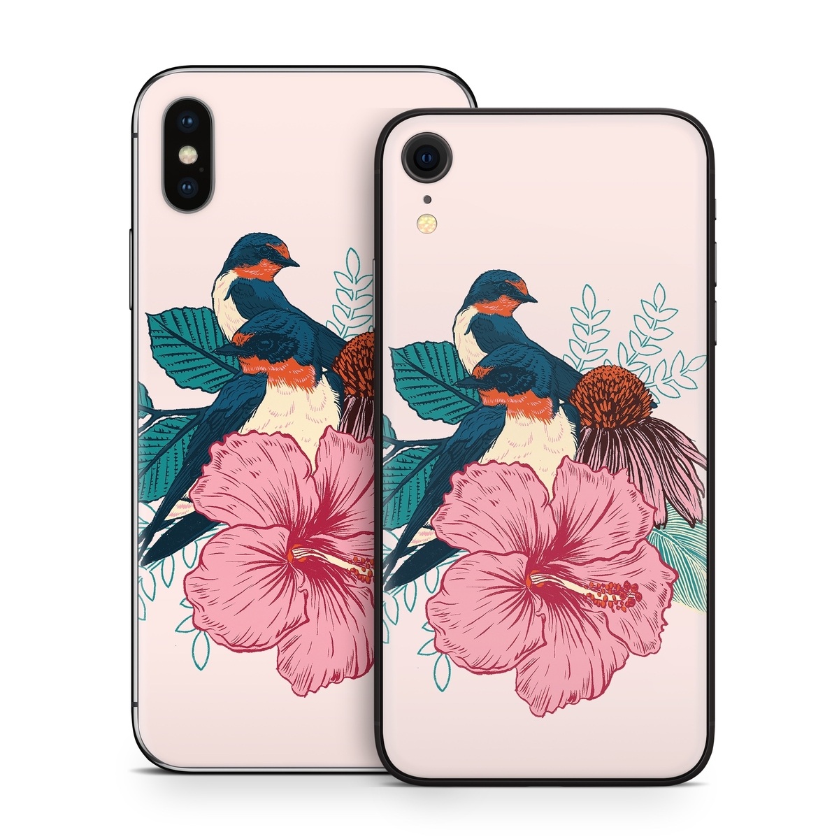 iStyles iPhone X Series Skin design of Bird, Hawaiian hibiscus, Hibiscus, Illustration, Chinese hibiscus, Botany, Flower, Plant, Malvales, Mallow family, with blue, pink, green, yellow, red colors, and tagged with animals, flowers, nature.