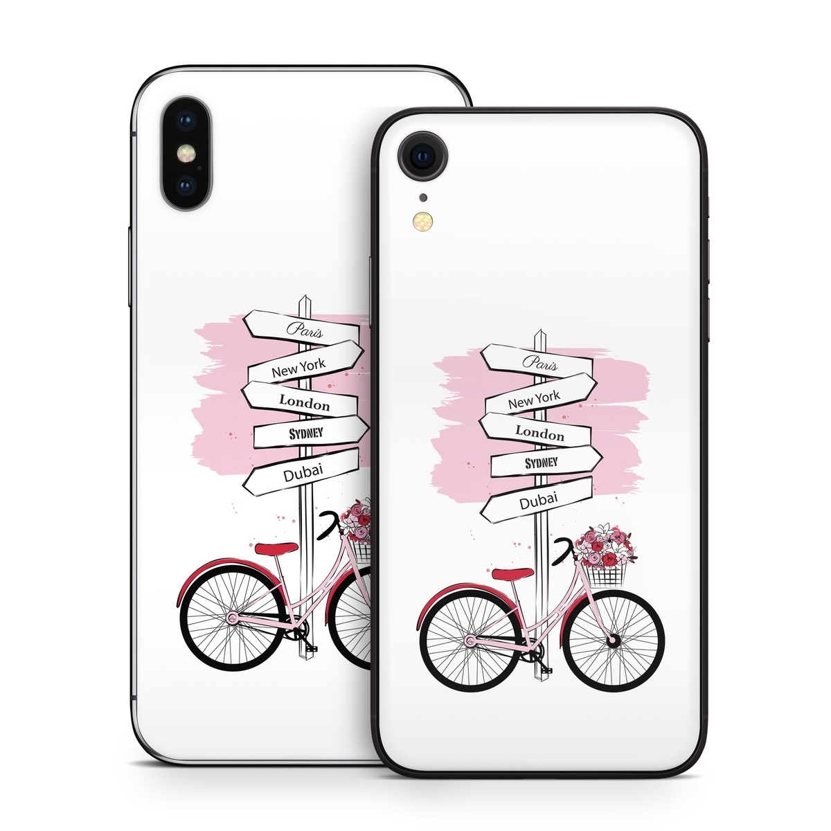 iStyles iPhone X Series Skin design of Bicycle, Wheel, Bicycles--Equipment and supplies, Tire, Bicycle tire, Bicycle frame, Bicycle wheel, Bicycle wheel rim, Vehicle, Bicycle fork, with white, black, red, pink colors, and tagged with signs, objects, flowers, patterns, bike, flowers, pink, travel, paris, new, york, london, sydney, dubai.