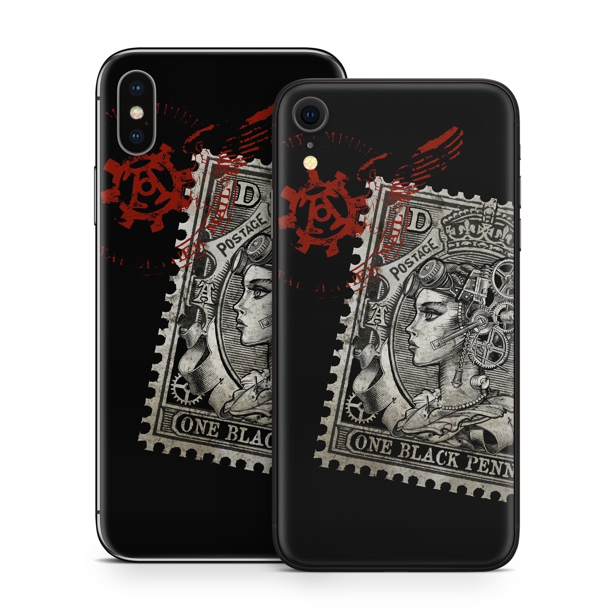 iStyles iPhone X Series Skin design of Font, Postage stamp, Illustration, Drawing, Art, with black, gray, red colors, and tagged with people, objects, signs.