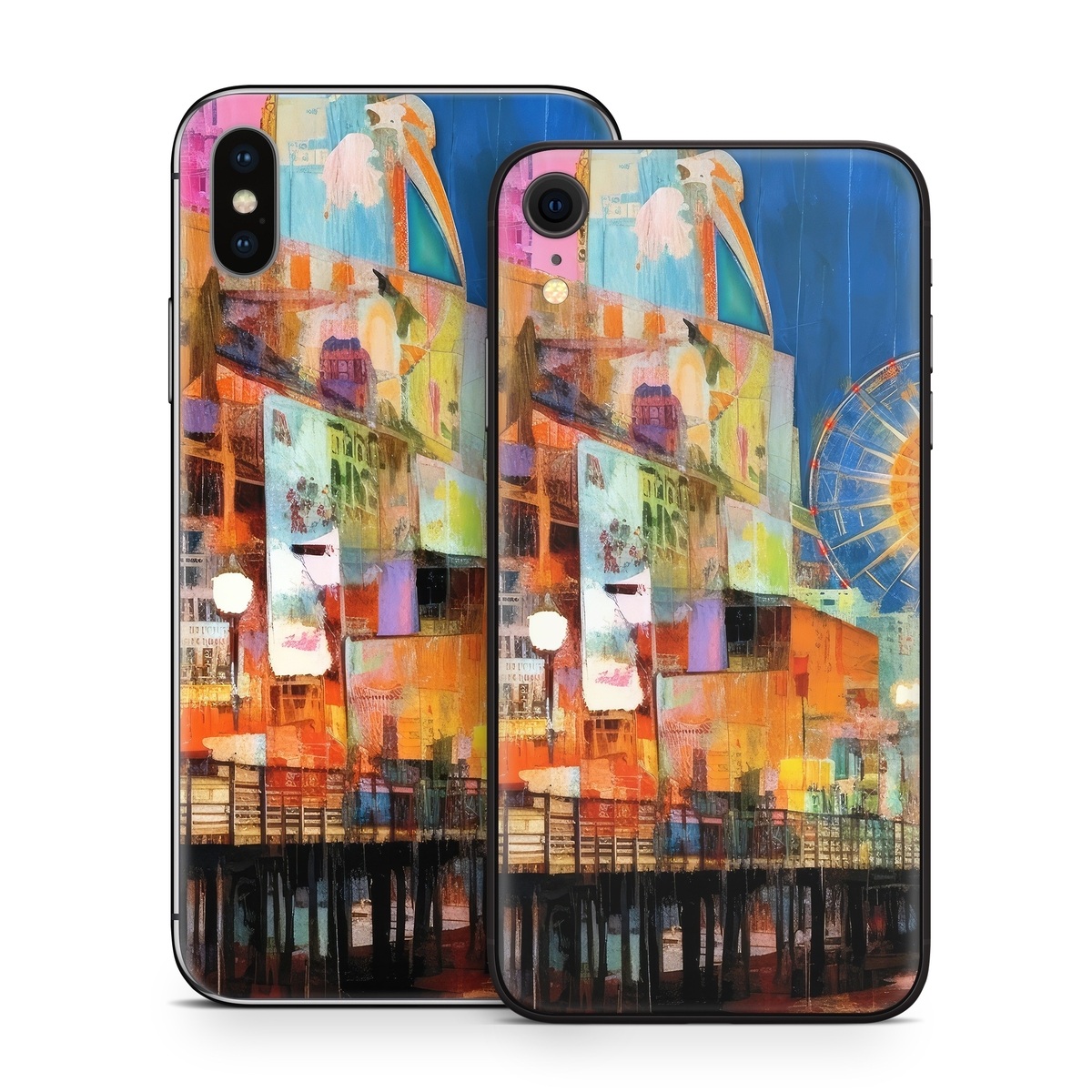 iStyles iPhone X Series Skin design of Light, World, Window, Tints and shades, City, Art, Leisure, Event, Building, Ferris wheel, with black, white, blue, pink, red, orange, yellow, green colors, and tagged with fineart, urban, objects, seaside, ferry, wheel, buildings, stores, reflection.