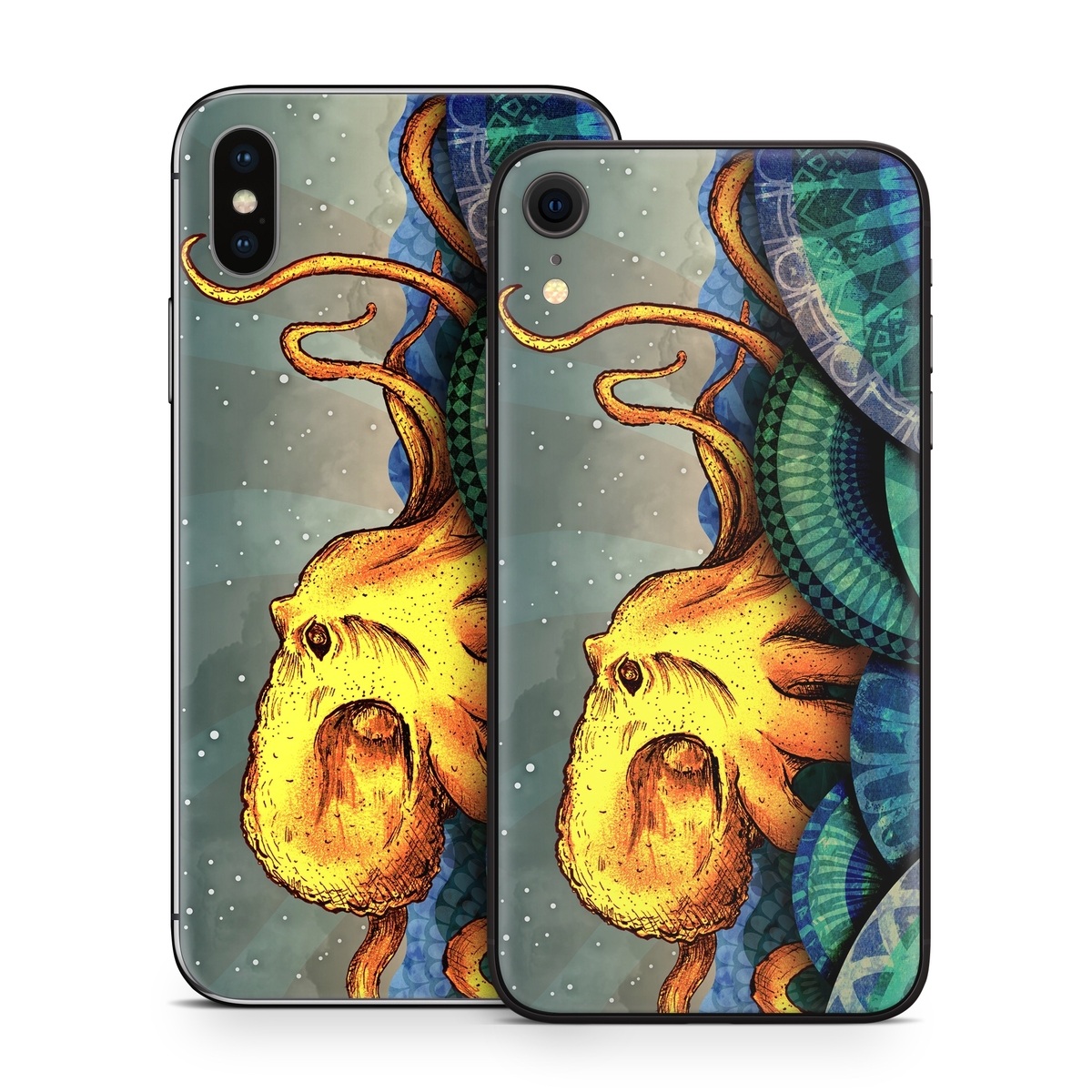 iStyles iPhone X Series Skin design of Illustration, Fractal art, Art, Cg artwork, Sky, Organism, Psychedelic art, Graphic design, Graphics, Octopus, with black, gray, blue, green, red colors, and tagged with animals, fantasy.
