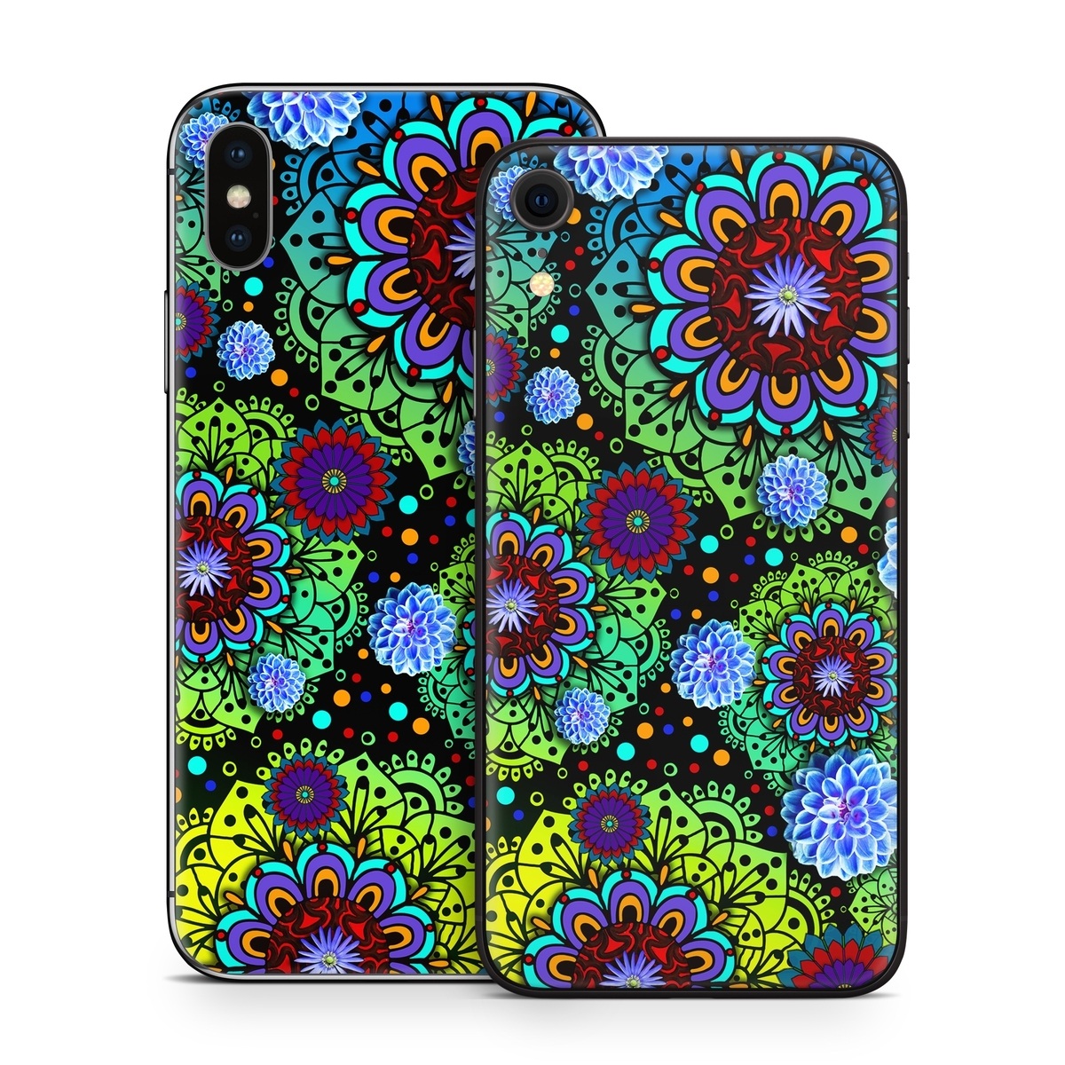 iStyles iPhone X Series Skin design of Pattern, Psychedelic art, Design, Flower, Art, Visual arts, Floral design, Plant, Textile, Symmetry, with black, blue, green, purple colors, and tagged with patterns, flowers.