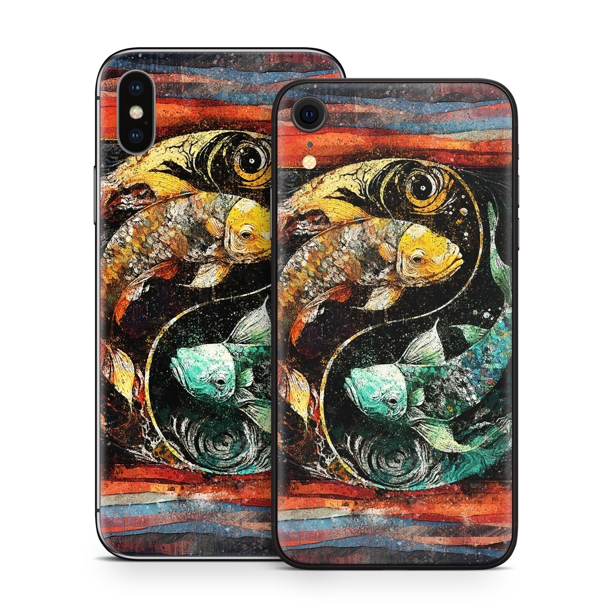 iStyles iPhone X Series Skin design of Art paint, Paint, Painting, Art, Creative arts, Pattern, Visual arts, Mural, Illustration, Graphics, with black, red, blue, yellow, green, orange, purple colors, and tagged with animals, signs, asian, koi, yin, yang.