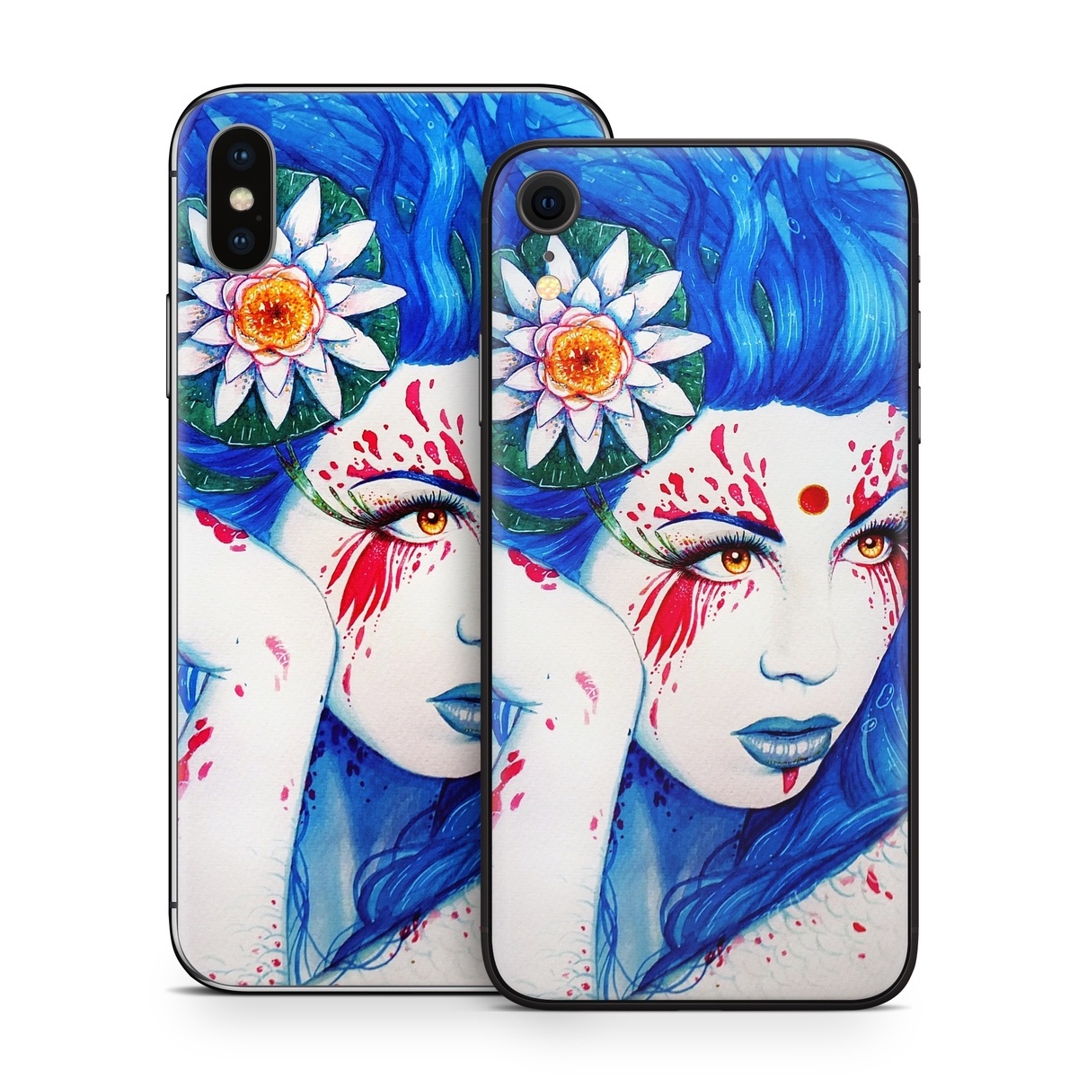 iStyles iPhone X Series Skin design of Hairstyle, Paint, Art paint, Blue, Painting, Eyelash, Art, Artist, Electric blue, Illustration, with white, blue, red, yellow, green, orange colors, and tagged with animals, people, flowers, fantasy, blue, fish, goldfish, koi, lilypad, red, sea, woman.