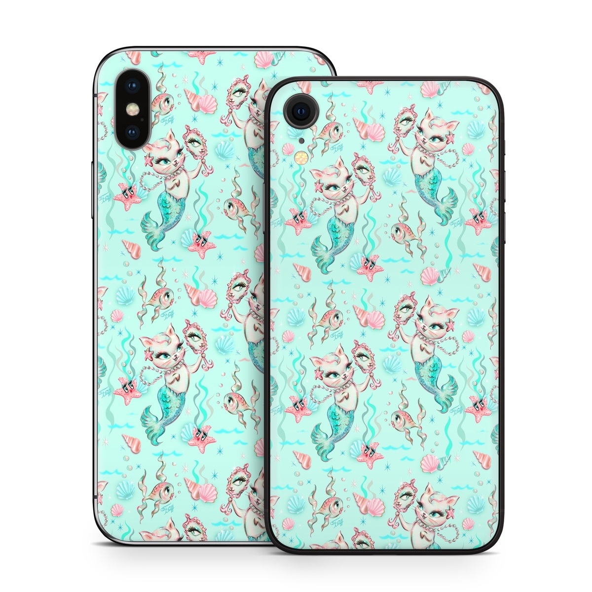 iStyles iPhone X Series Skin design of Green, Aqua, Pattern, Teal, Turquoise, Pink, Textile, Wrapping paper, Design, with blue, pink, white, green colors, and tagged with patterns, animals, fantasy, objects, animals, cat, kitten, kittens, mermaid, mermaids, ocean, pastel, pattern, sea, sealife.