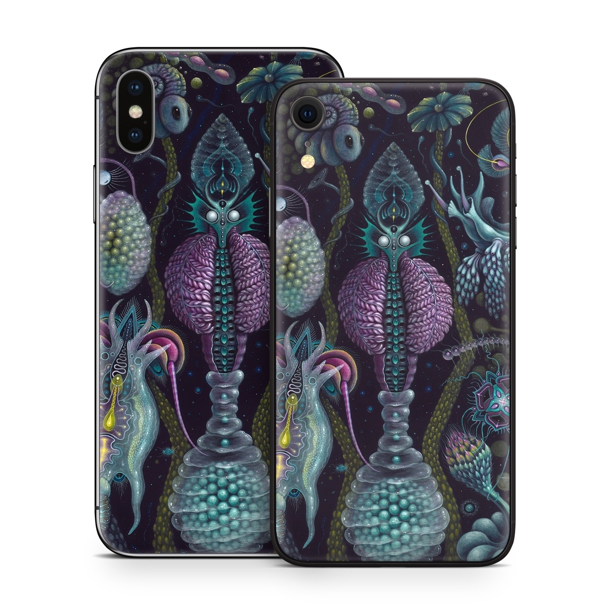 iStyles iPhone X Series Skin design of Organism, Pattern, Art, Illustration, Fractal art, Psychedelic art, Design, Visual arts, Plant, Modern art, with black, green, purple, pink, yellow, blue colors, and tagged with animals, fantasy, abstract, bugs, creatures, sci-fi, sealife.
