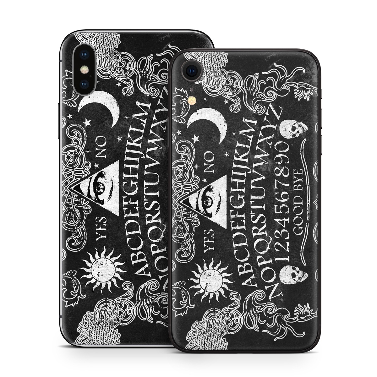 iStyles iPhone X Series Skin design of Text, Font, Pattern, Design, Illustration, Headpiece, Tiara, Black-and-white, Calligraphy, Hair accessory, with black, white, gray colors, and tagged with signs, skulls, black, demons, ghosts, magic, magick, paranormal, skull, spirit, talking.
