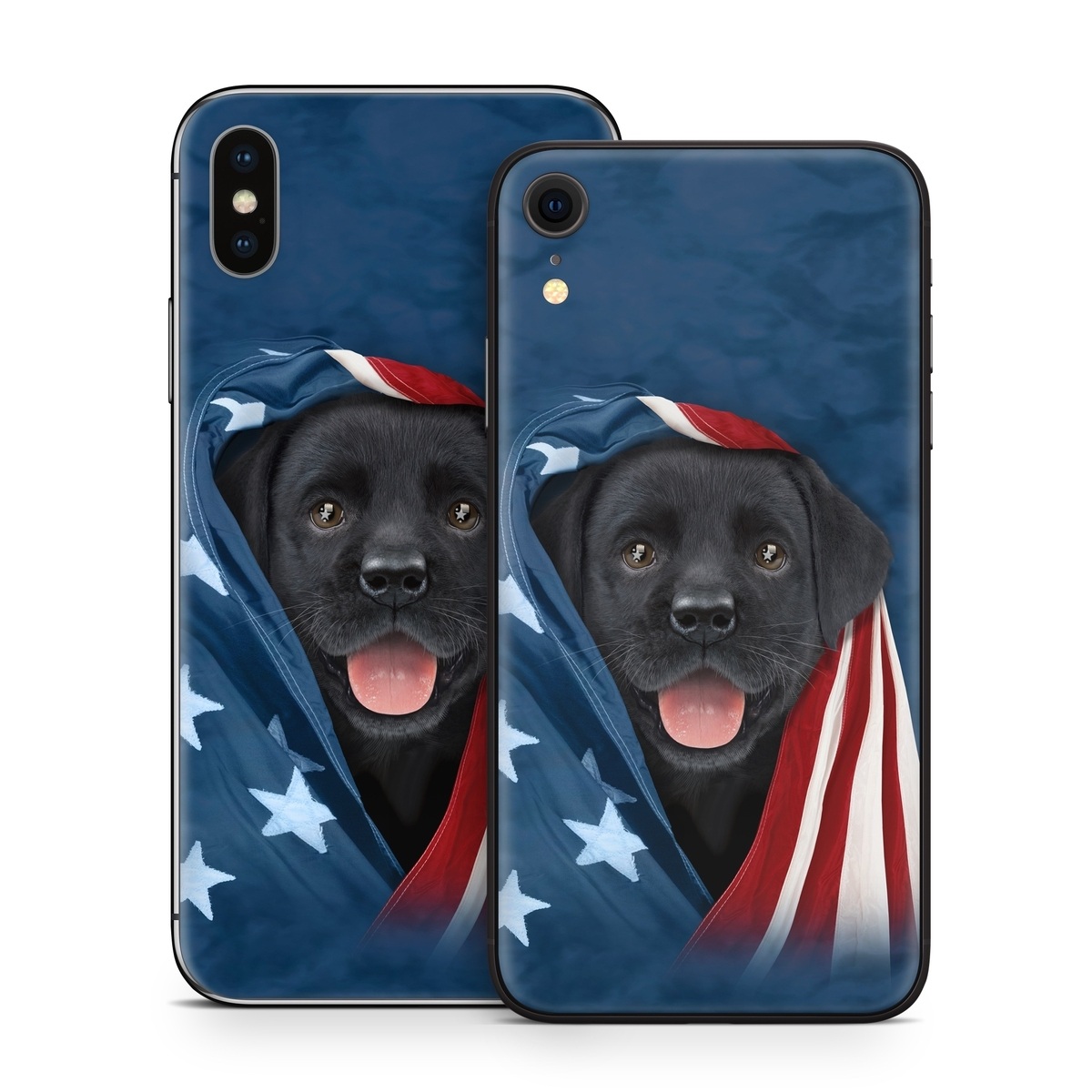 iStyles iPhone X Series Skin design of Canidae, Dog, Dog breed, Flag, Snout, Carnivore, Sporting Group, Labrador retriever, Flag of the united states, Puppy, with black, gray, white, blue, red colors, and tagged with animals, flags, labrador, retriever, america, animal, blue, dog, flags, patriotic, puppy, red, usa, white, .