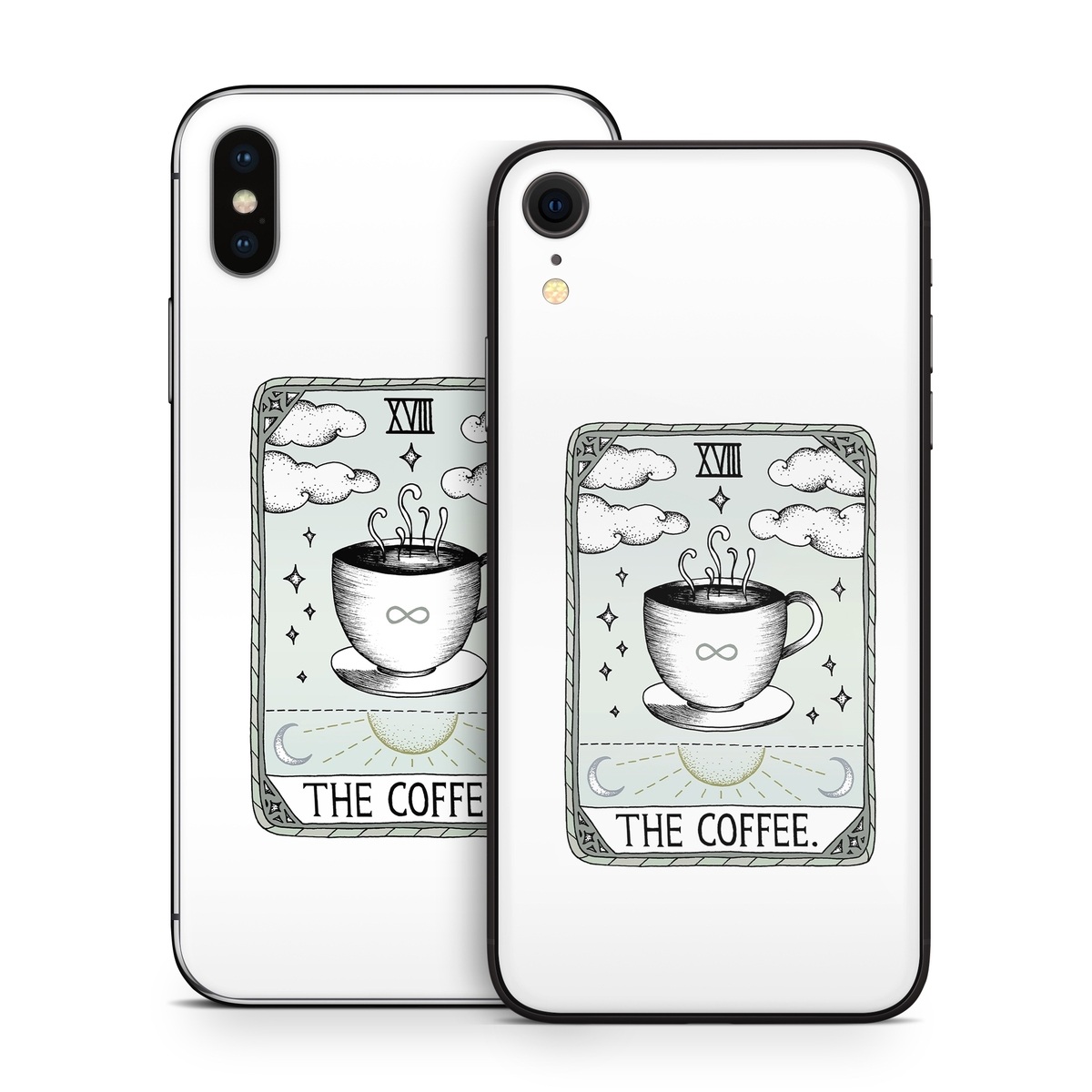 iStyles iPhone X Series Skin design of Cup, Cartoon, Drinkware, Coffee cup, Tableware, Teacup, Illustration, Drink, Line art, with white, black, green, gray, yellow colors, and tagged with objects, signs, space, coffee, handdrawn, pastel, sketch, tarot.