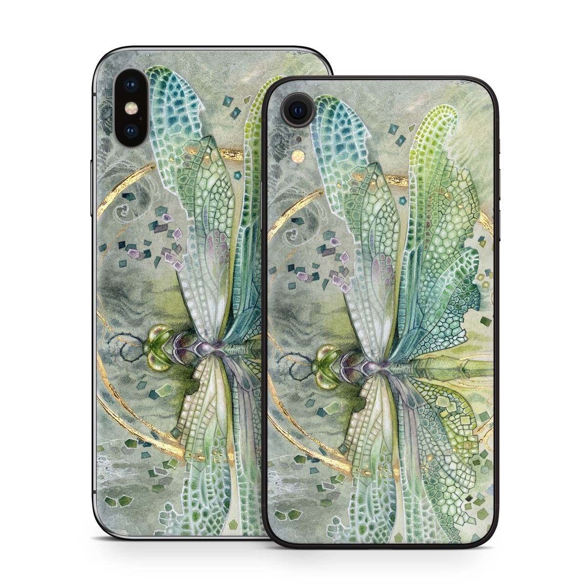 iStyles iPhone X Series Skin design of Green, Painting, Watercolor paint, Water, Acrylic paint, Leaf, Visual arts, Plant, Art, Photography, with green, yellow, blue, gray colors, and tagged with animals, bugs, dragonfly, insects.