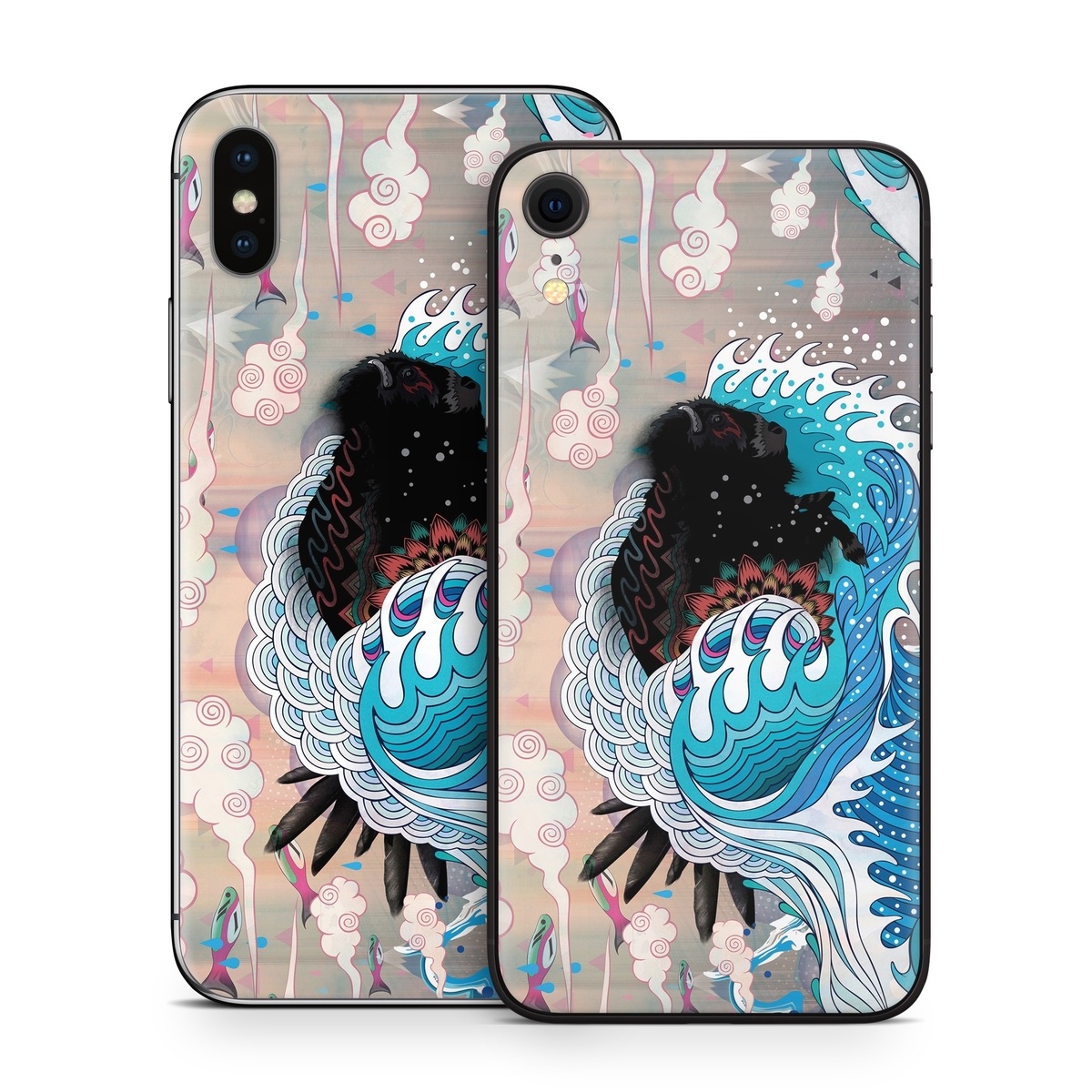 iStyles iPhone X Series Skin design of Blue, Turquoise, Illustration, Aqua, Graphic design, Pattern, Art, Design, Graphics, Visual arts, with gray, blue, black, pink, white colors, and tagged with abstract, animals, nature, bison, blue, buffalo, bull, greatwave, ocean, teal, wave.