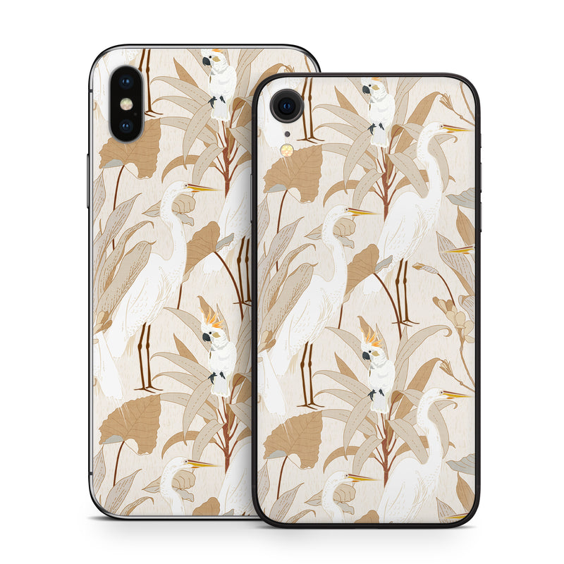 iStyles iPhone X Series Skin design of Plant, Branch, Organism, Twig, Art, Fawn, Painting, Tail, Pattern, Illustration, with white, brown, gray, yellow, orange colors, and tagged with animals, nature, parrot, cranes, birds.