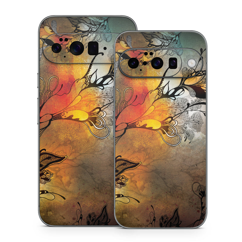 iStyles Google Pixel 10 Series Skin design of Yellow, Orange, Art, Branch, Leaf, Graphic design, Visual arts, Pattern, Design, Modern art, with black, red, orange, yellow colors, and tagged with abstract.