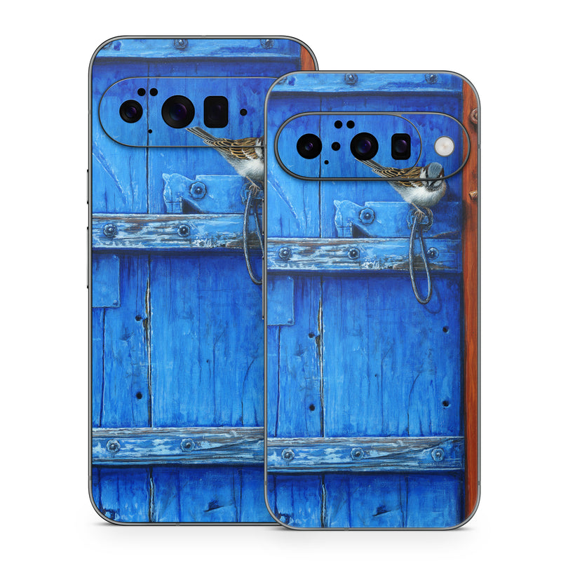 iStyles Google Pixel 10 Series Skin design of Blue, Wood, Door handle, Door, Wall, Door knocker, Electric blue, Still life photography, Window, Handle, with red, blue, brown colors, and tagged with animals, fineart, animal, bird, birds, fineart, outdoors.
