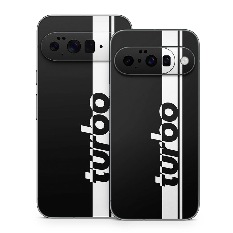 iStyles Google Pixel 10 Series Skin design of Font, Tints and shades, Rectangle, Electric blue, Logo, Brand, Graphics, Pattern, Darkness, Monochrome photography, with black, white colors, and tagged with signs, lookslike, turbo, racecar.