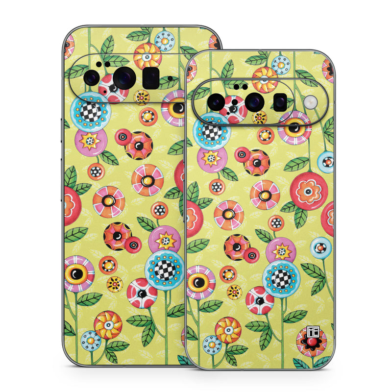iStyles Google Pixel 10 Series Skin design of Wrapping paper, Pattern, Textile, Design, Visual arts, Wildflower, Art, Plant, Child art, Flower, with green, blue, red, yellow, orange, pink colors, and tagged with patterns, flowers, nature.