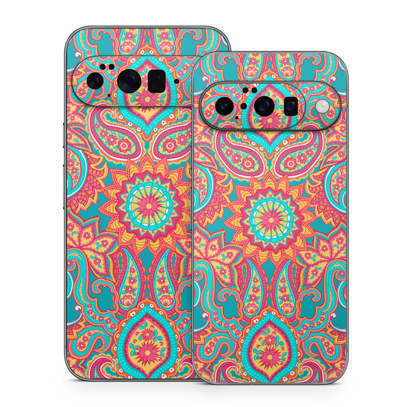 iStyles Google Pixel 10 Series Skin design of Pattern, Paisley, Motif, Visual arts, Design, Art, Textile, Psychedelic art, with orange, yellow, blue, red colors, and tagged with patterns, flowers.