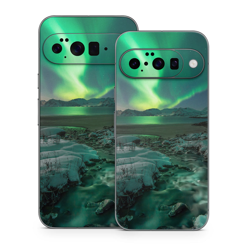 iStyles Google Pixel 10 Series Skin design of Nature, Aurora, Sky, Geological phenomenon, Water, Atmosphere, Space, Landscape, World, Glacier, with white, green, blue, black, gray colors, and tagged with nature, photos, arctic, cold, mountains, northernlights, photography, snow.