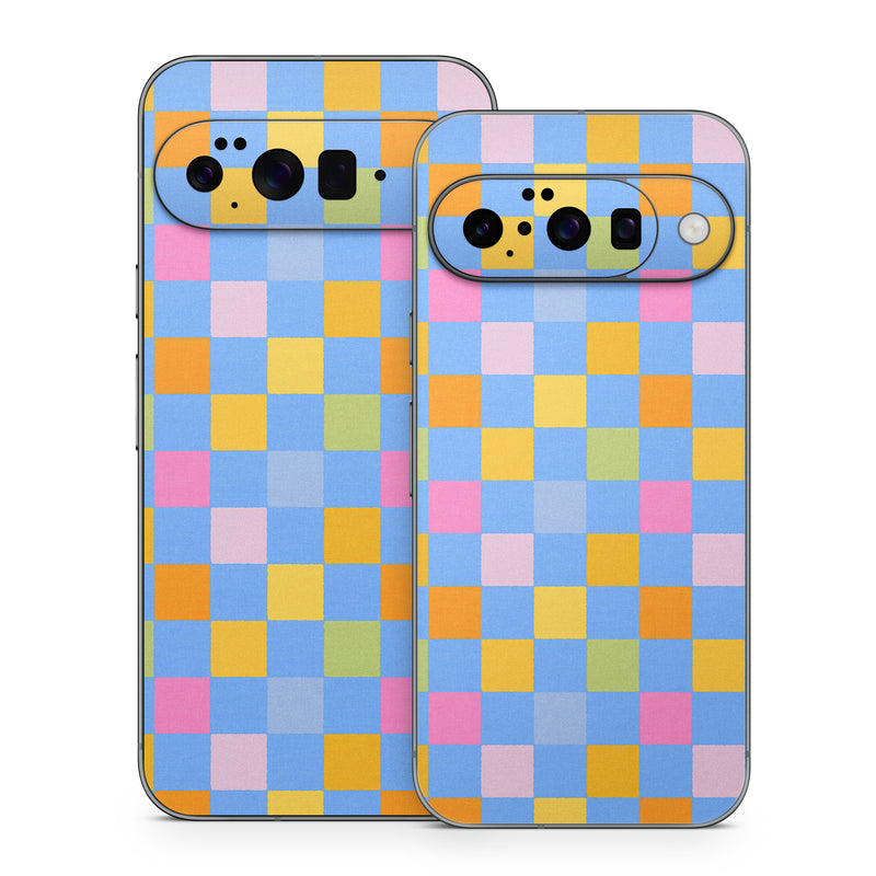 iStyles Google Pixel 10 Series Skin design of Rectangle, Azure, Textile, Orange, Aqua, Font, Symmetry, Magenta, Tints and shades, Parallel, with blue, yellow, orange, green, pink colors, and tagged with patterns, checkered, squares, colorful.