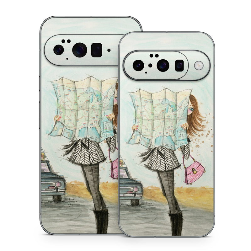 iStyles Google Pixel 10 Series Skin design of Fashion illustration, Sketch, Watercolor paint, Illustration, Drawing, Art, Footwear, Vehicle, Painting, Fashion design, with blue, black, gray, white, pink, brown, green, orange, yellow colors, and tagged with people, fineart, objects, fashion, maps, adventure, driving, fashion, map, roadtrip.