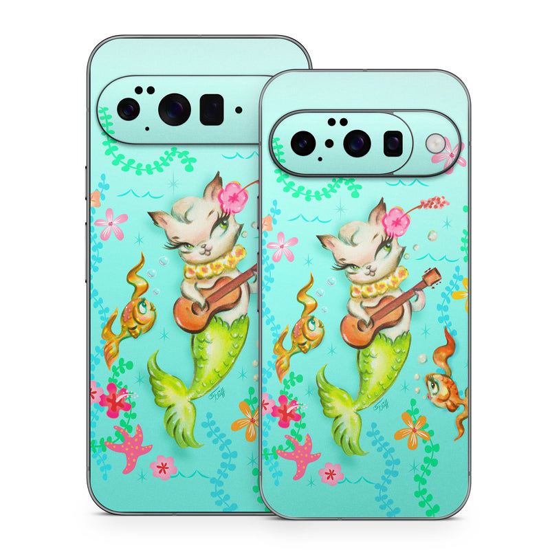 iStyles Google Pixel 10 Series Skin design of Fictional character, Illustration, Mermaid, Mythical creature, Clip art, Art, with blue, green, pink, yellow, orange, white, gray, brown colors, and tagged with fantasy, animals, flowers, nature, objects, animal, animals, beach, cat, floral, flowers, kitten, mermaid, music, ocean, pastel, pinup, pinupgirl, pinupstyle, sealife.