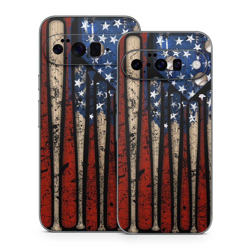 iStyles Google Pixel 10 Series Skin design of Baseball bat, Baseball equipment, with black, red, gray, green, blue colors, and tagged with patterns, signs, flags.