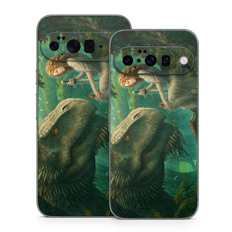 iStyles Google Pixel 10 Series Skin design of Dinosaur, Cg artwork, Mythology, Fictional character, Troodon, Extinction, Velociraptor, Illustration, Animated cartoon, Tyrannosaurus, with black, green, gray, red colors, and tagged with animals, people, nature, fantasy, objects.