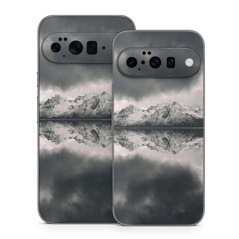 iStyles Google Pixel 10 Series Skin design of Sky, Cloud, Nature, Reflection, Water, Atmospheric phenomenon, Daytime, Black-and-white, Atmosphere, Calm, with white, black, gray colors, and tagged with nature, photos, dark, lake, landscape, mountains, photo, photography.