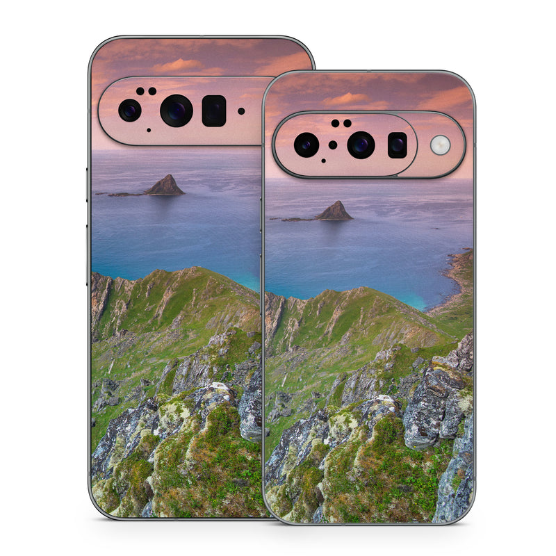 iStyles Google Pixel 10 Series Skin design of Body of water, Nature, Sky, Coast, Sea, Headland, Natural landscape, Promontory, Coastal and oceanic landforms, Cliff, with red, orange, green, blue, yellow colors, and tagged with nature, photos, landscape, mountains, ocean, photo, photography, sunset.