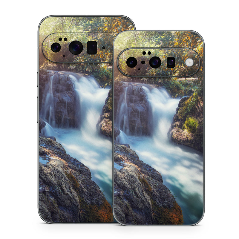 iStyles Google Pixel 10 Series Skin design of Waterfall, Natural landscape, Body of water, Nature, Water resources, Water, Watercourse, Stream, Nature reserve, Rock, with gray, yellow, orange, green, white, blue colors, and tagged with nature, photos, hiking, landscapes, outdoors, photography, waterfall.