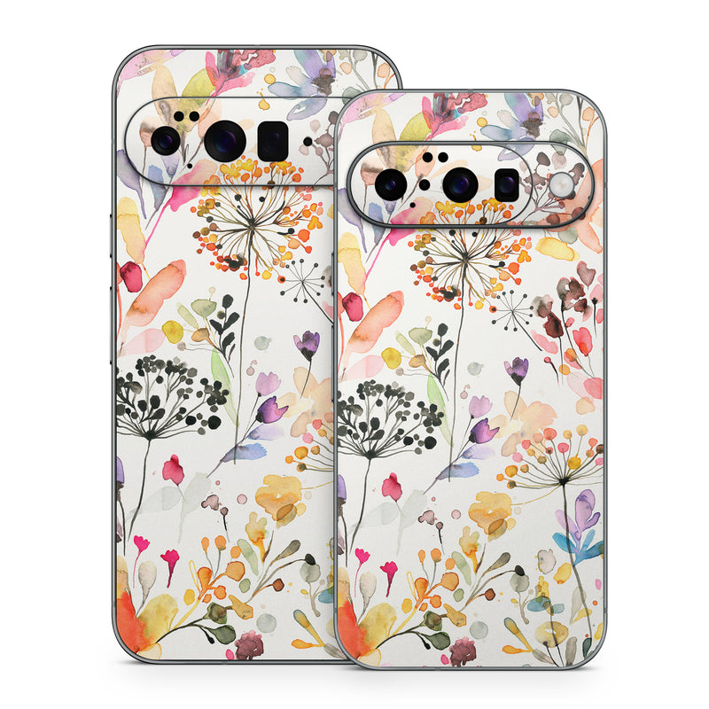 iStyles Google Pixel 10 Series Skin design of Flower, Petal, Rectangle, Branch, Creative arts, Plant, Line, Art, Painting, Font, with white, pink, red, yellow, orange, green, blue, purple colors, and tagged with patterns, flowers, nature, flower, flowers, garden, grass, nature, outdoors, watercolor.