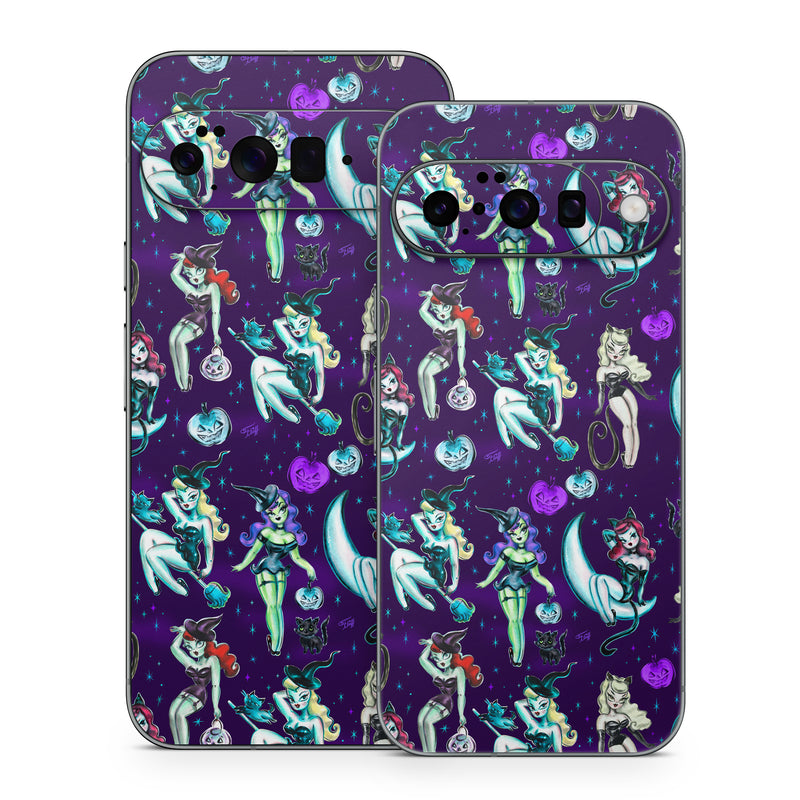 iStyles Google Pixel 10 Series Skin design of Illustration, Cartoon, Violet, Art, Fictional character, Graphic design, Fiction, Visual arts, Style, Graphics, with blue, green, white, yellow, red, purple colors, and tagged with people, fantasy, objects, animals, blackcat, cat, halloween, pinup, pinupgirl, witche, witches.