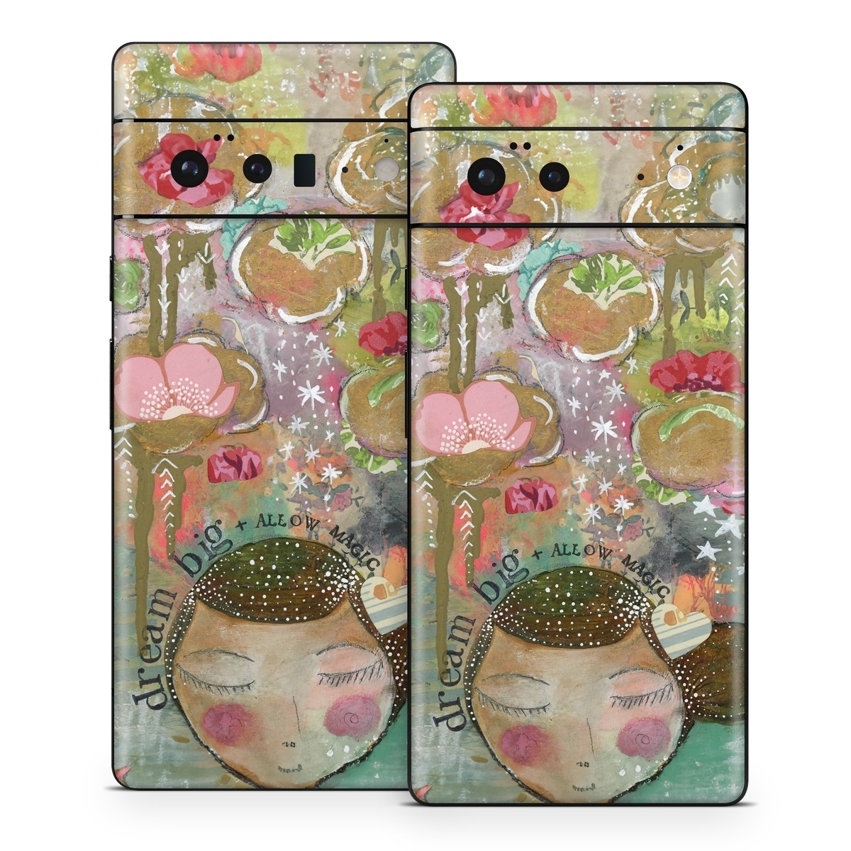 iStyles Google Pixel 6 Series Skin design of Painting, Pink, Illustration, Art, Child art, Watercolor paint, Drawing, Visual arts, Still life, with brown, pink, red, green, white, black, orange, gray colors, and tagged with flowers, signs, people, dream, flowers, magic, nature, painting.