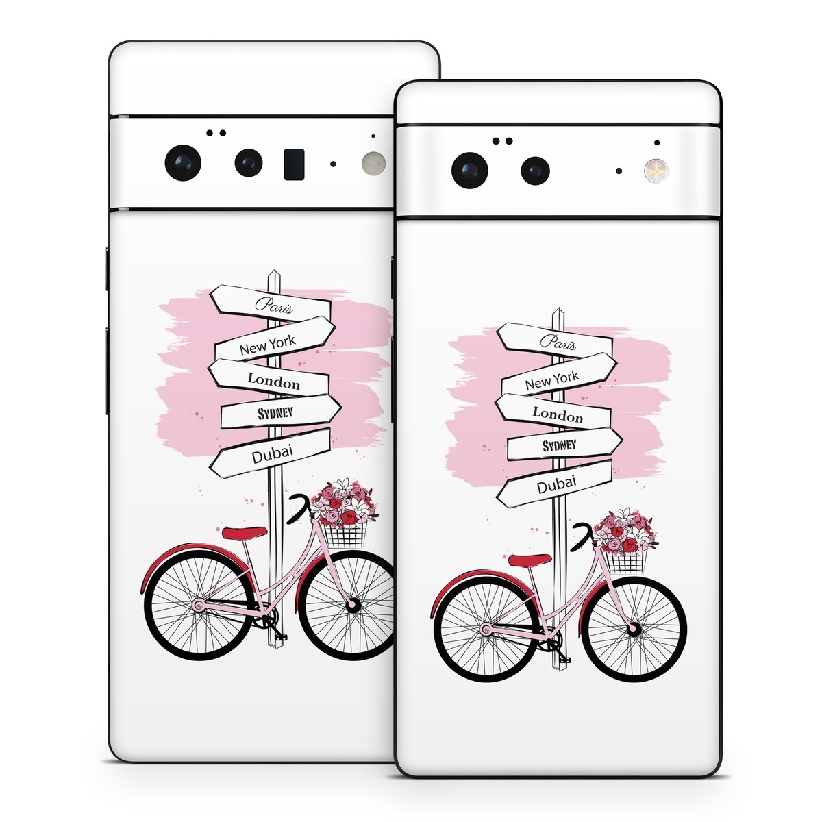 iStyles Google Pixel 6 Series Skin design of Bicycle, Wheel, Bicycles--Equipment and supplies, Tire, Bicycle tire, Bicycle frame, Bicycle wheel, Bicycle wheel rim, Vehicle, Bicycle fork, with white, black, red, pink colors, and tagged with signs, objects, flowers, patterns, bike, flowers, pink, travel, paris, new, york, london, sydney, dubai.