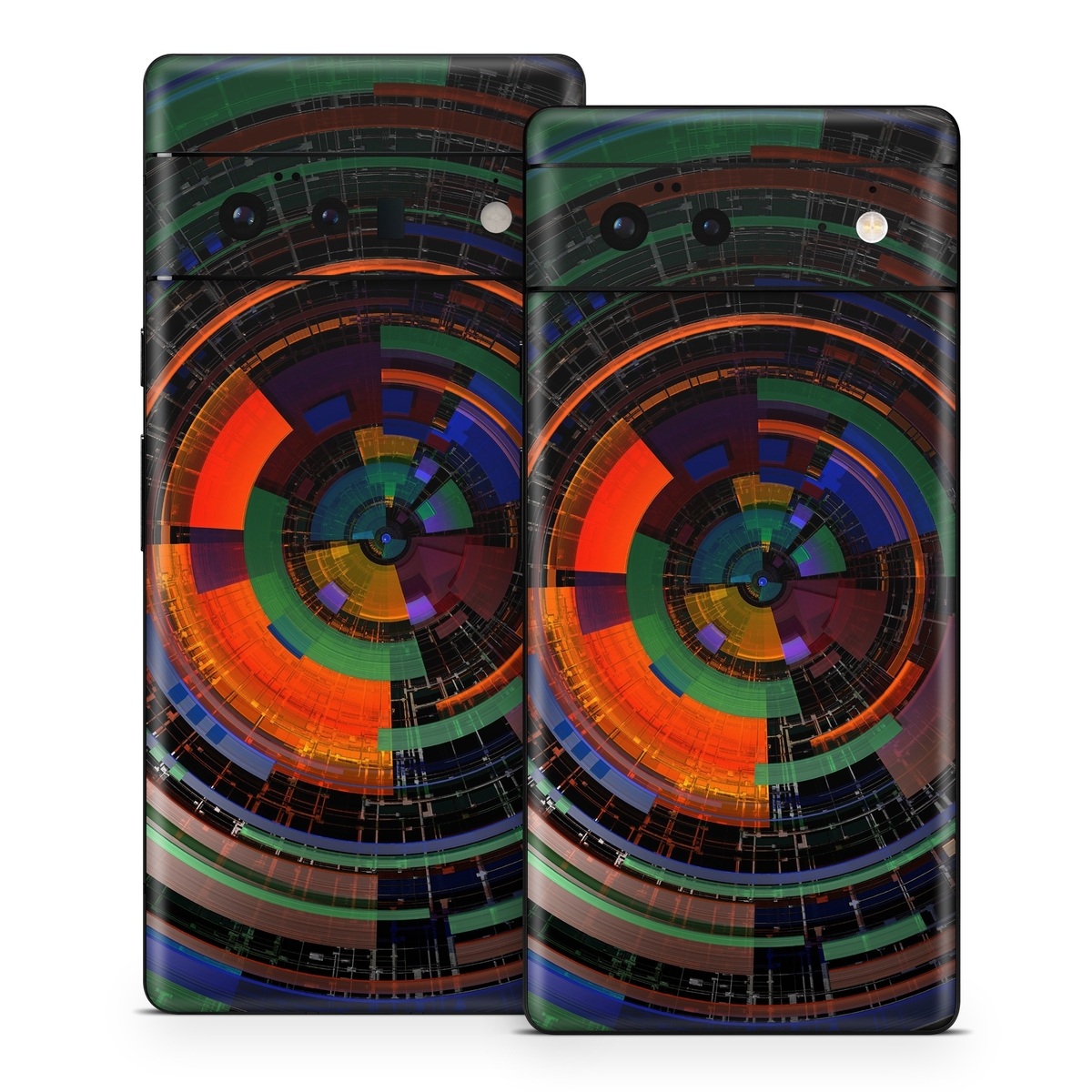 iStyles Google Pixel 6 Series Skin design of Colorfulness, Pattern, Circle, Design, Architecture, Symmetry, Art, Spiral, Psychedelic art, with black, red, blue, green, orange, brown colors, and tagged with abstract, patterns.