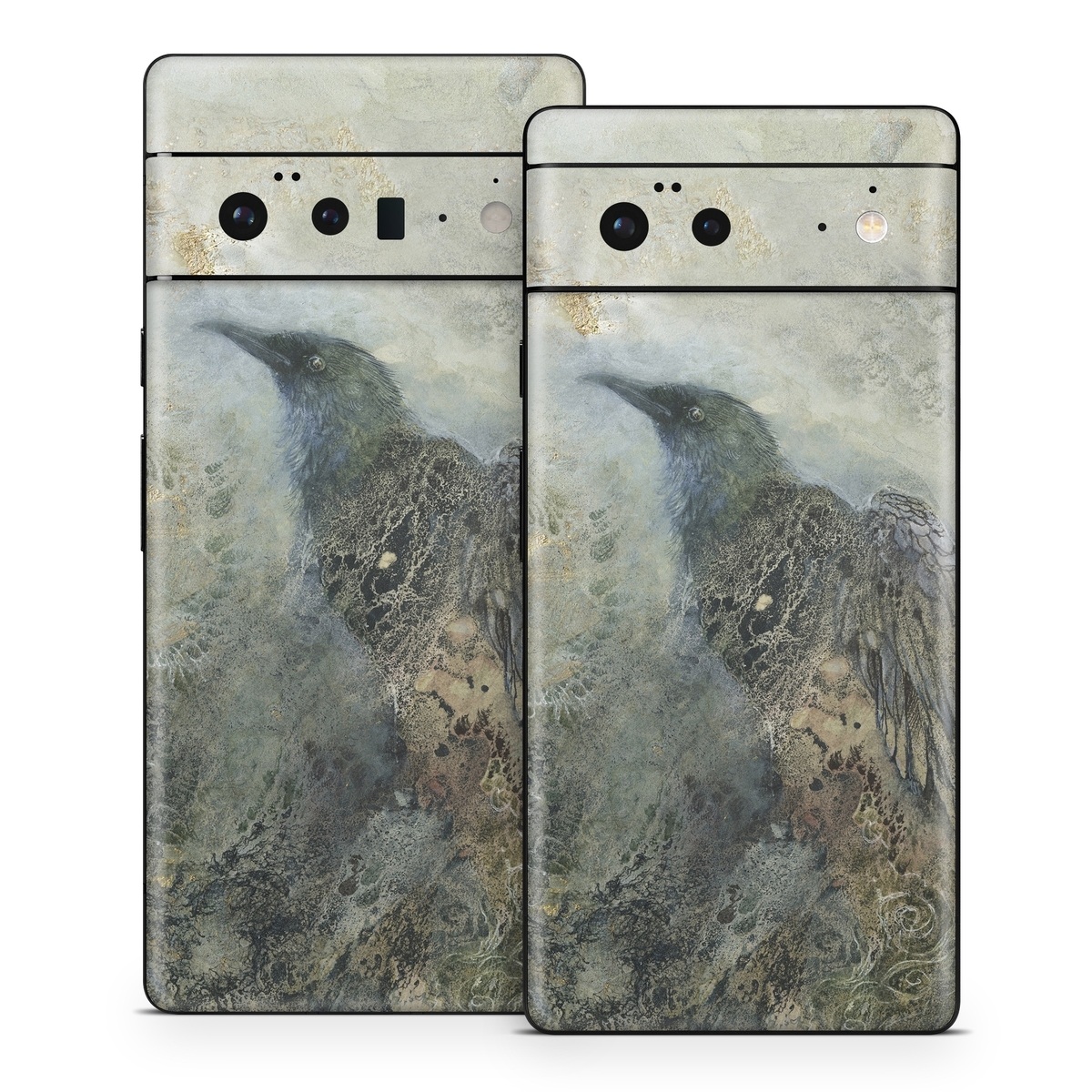 iStyles Google Pixel 6 Series Skin design of Painting, Water, Geology, Art, Rock, Watercolor paint, Illustration, with black, gray, white, blue colors, and tagged with animals, abstract, bird, birds, raven.