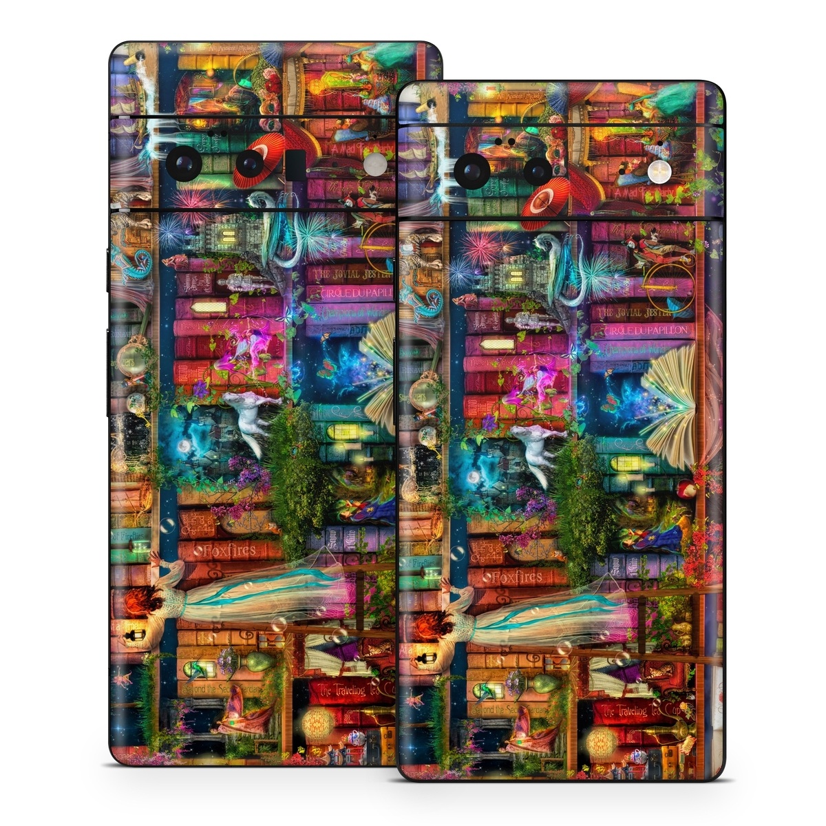 iStyles Google Pixel 6 Series Skin design of Painting, Art, Theatrical scenery, with black, red, gray, green, blue colors, and tagged with patterns, animals, people, objects, nature, fantasy, space.