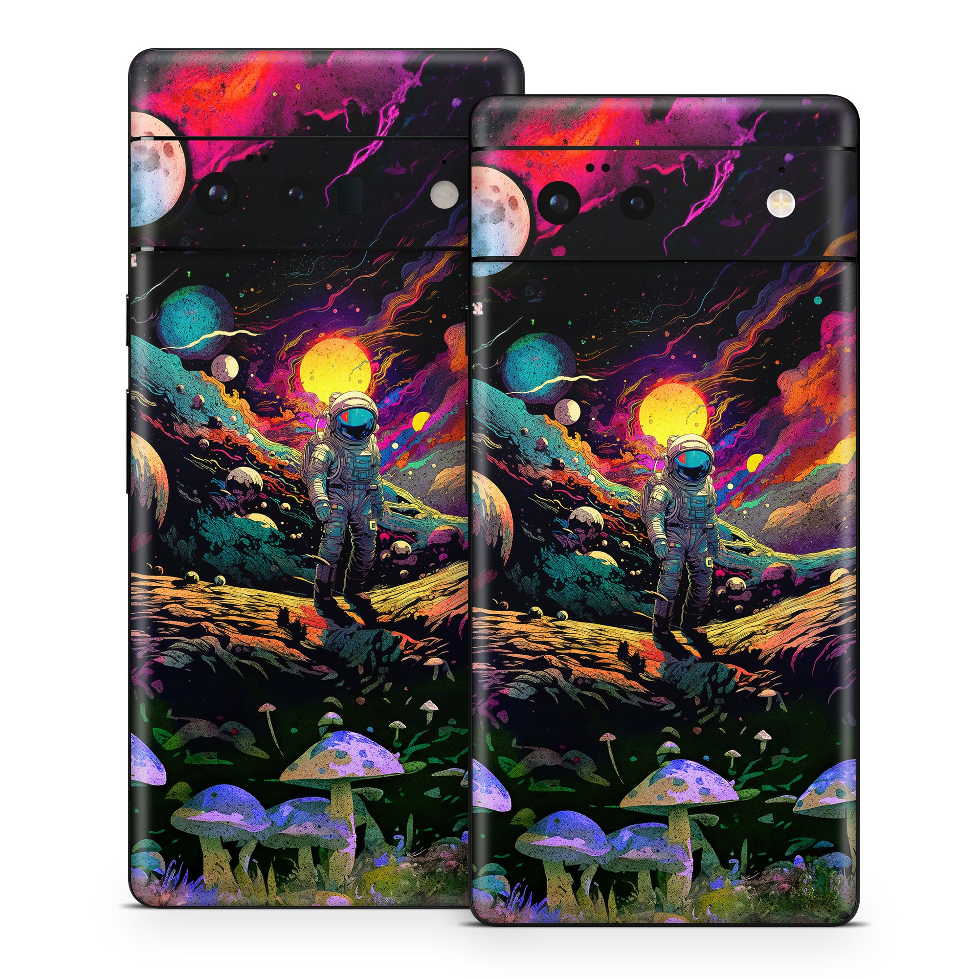 iStyles Google Pixel 6 Series Skin design of Light, Nature, Purple, Umbrella, Plant, Art, Terrestrial plant, Natural landscape, Astronomical object, Space, with black, white, purple, red, gray, orange, yellow, blue, green, brown colors, and tagged with space, people, fantasy, astronaut, plants, sun, moon, galaxy, mushrooms.