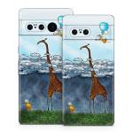 iStyles Google Pixel 7 Series Skin design of Giraffe, Sky, Tree, Water, Branch, Giraffidae, Illustration, Cloud, Grassland, Bird, with blue, gray, yellow, green colors, and tagged with animals, nature, objects.
