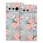 iStyles Google Pixel 7 Series Skin design of Pattern, Aqua, Wrapping paper, Textile, Design, Floral design, Wildflower, Plant, Pedicel, Blossom, with pink, red, blue, white colors, and tagged with patterns, flowers, florals, flowers, garden, green, pastelcolors, pink.