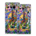 iStyles Google Pixel 7 Series Skin design of Textile, Organism, Painting, Art, Pattern, Creative arts, Electric blue, Visual arts, Graphics, Illustration, with purple, blue, white, black, yellow, orange, green, pink, brown, red colors, and tagged with music, signs, flowers, people, animals, nature, objects, alice, wonderland, checkered, rabbit, cat, violin, flowers, madhatter.