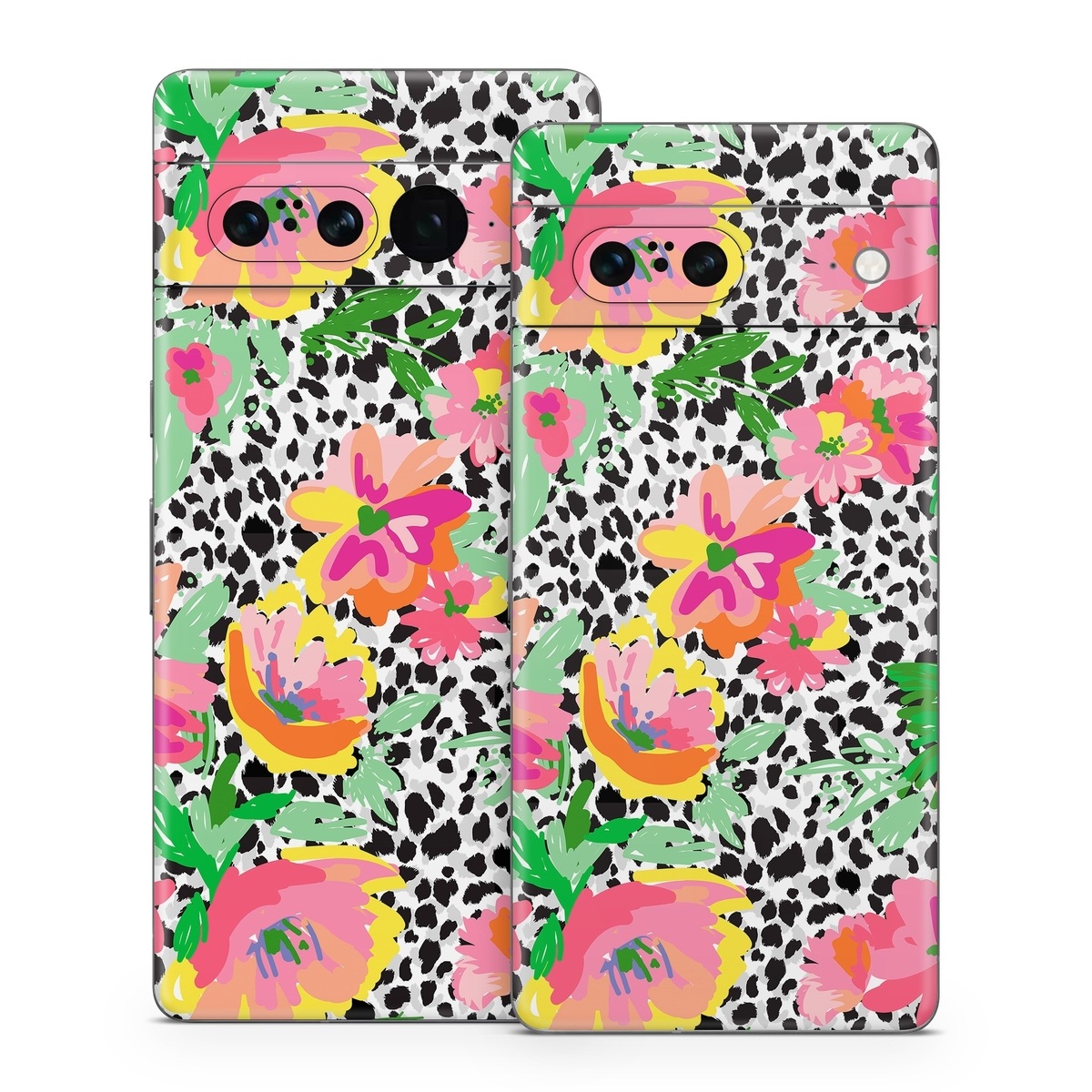 iStyles Google Pixel 7 Series Skin design of Flower, Petal, Textile, Pink, Creative arts, Art, Magenta, Pattern, Plant, Symmetry, with pink, orange, yellow, purple, green, black, white colors, and tagged with patterns, flowers, flowers, leaves, arrangement.