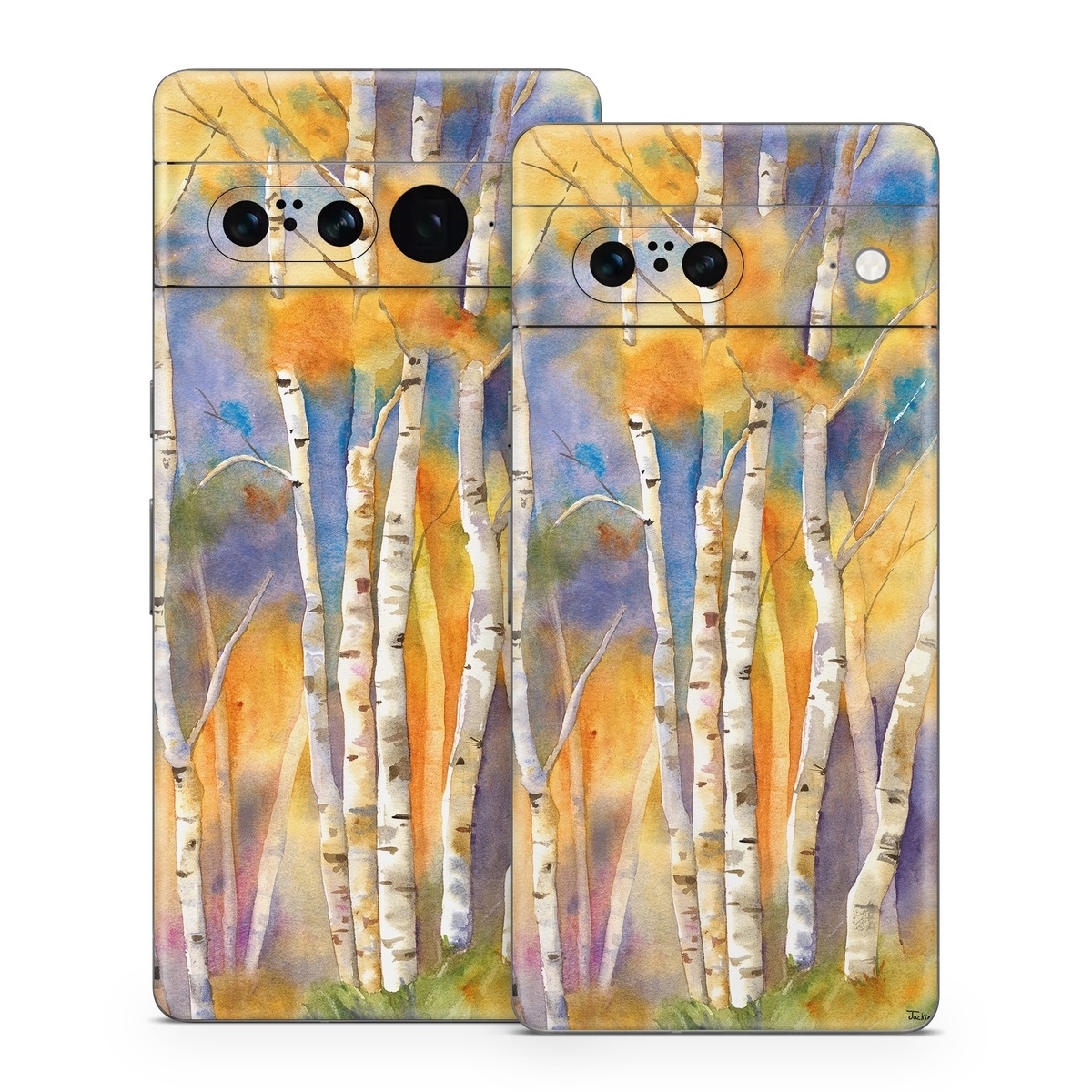 iStyles Google Pixel 7 Series Skin design of Canoe birch, Watercolor paint, Tree, Birch, Woody plant, Painting, Plant, Birch family, Paint, Trunk, with orange, yellow, green, white, purple, blue colors, and tagged with nature.
