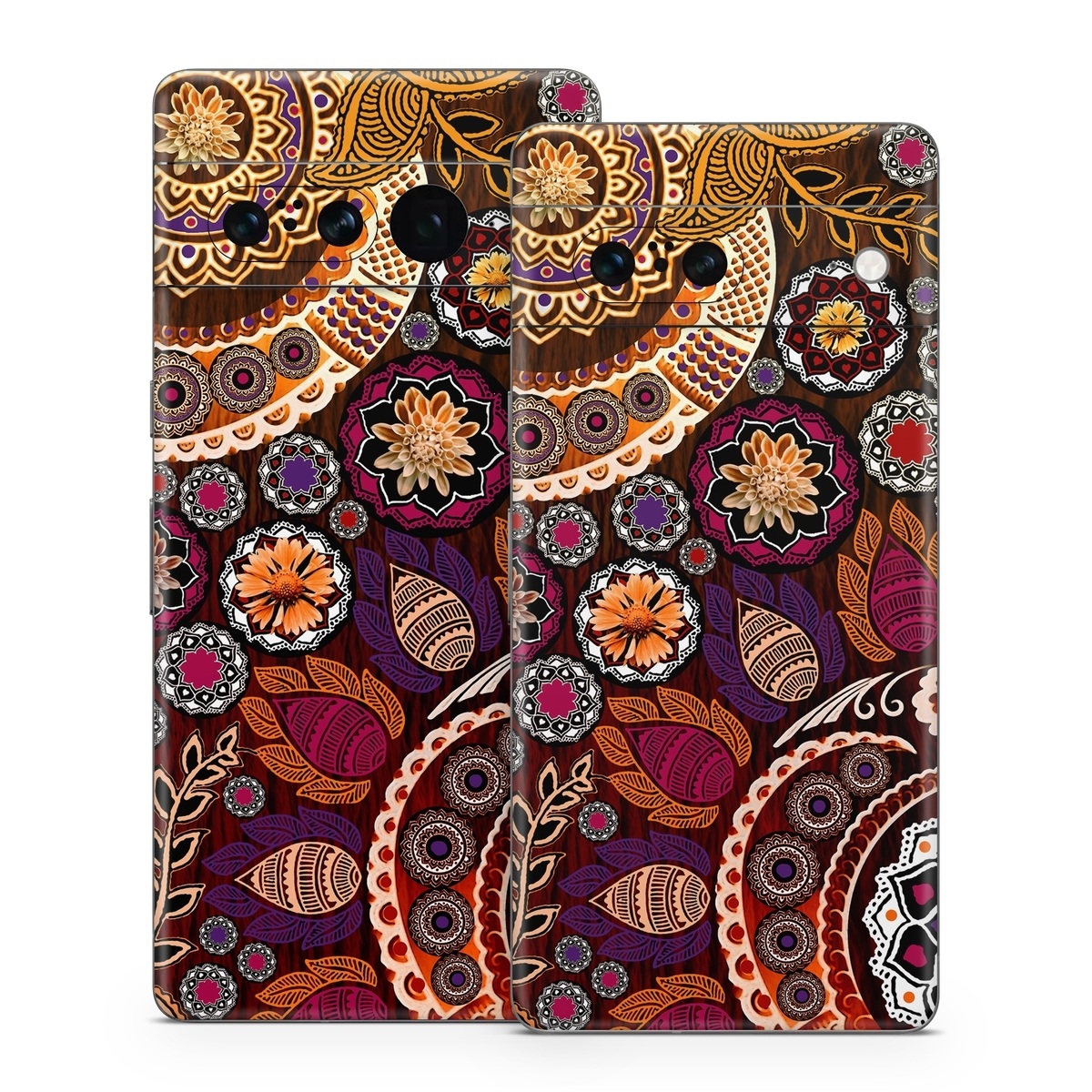 iStyles Google Pixel 7 Series Skin design of Pattern, Motif, Visual arts, Design, Art, Floral design, Textile, Paisley, Tapestry, Circle, with brown, purple, red, white, black colors, and tagged with patterns, flowers, nature.